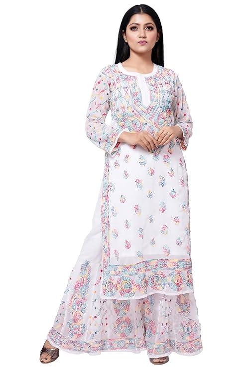 Women's Georgette Lucknowi Handicrafted Chikan Heavy Embroidery Kurta Sharara Set with Slip